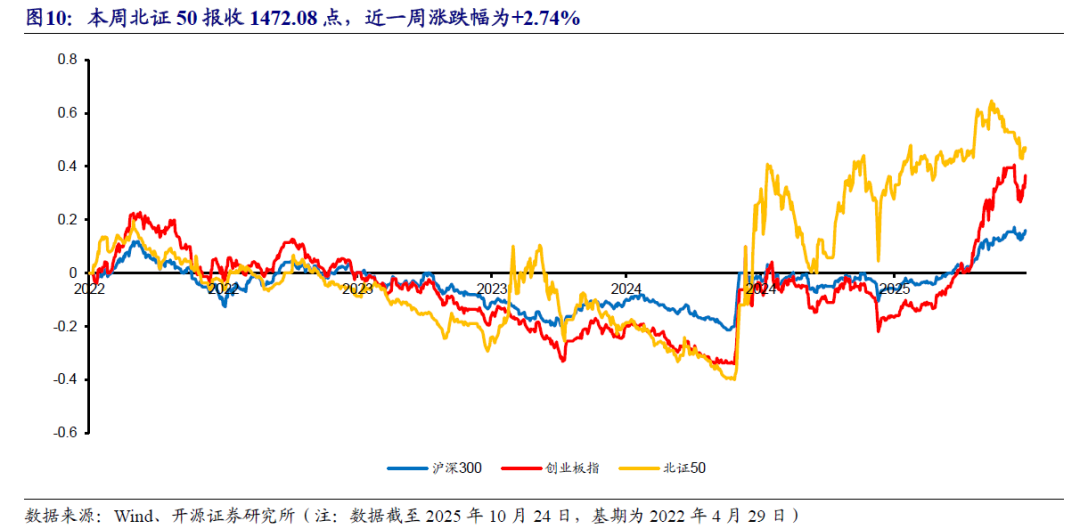 本周(2025年10月20日至2025年10月24日,下同),北证50报收1472.08点,周涨跌幅为+2.74%,沪深300报收4660.68点,周涨跌幅为+3.24%,创业板指报收3171.57点,周涨跌幅为+8.05%。