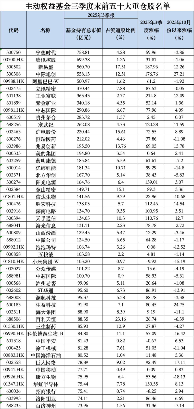 随着公募基金2025年三季报披露,主动权益基金最新重仓股也随之出炉。与以往腾讯控股、