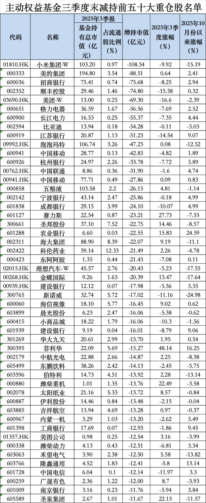 受三季度家电行业外销下滑、竞争加剧等因素影响,美的集团三季度股价仅微涨0.64%,主动权益基金减持美的集团市值超过88亿元,减持力度仅次于小米集团。
