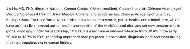 “在他带领下,中国癌症五年生存率实现跨越式提升,从21世纪初的30.9%提高到2021年的43.7%,在人口规模最大的国家创造了癌症防治领域的空前进步。”
