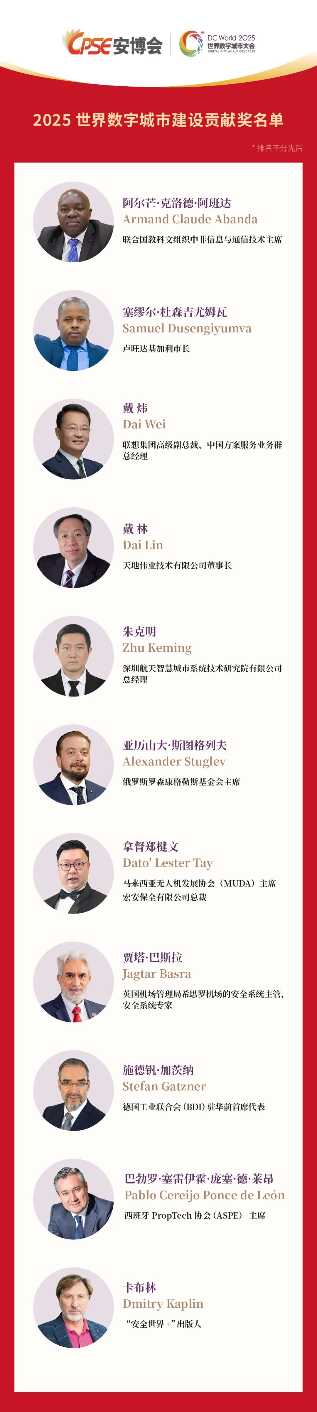 本次大会的另一焦点当属颁奖盛典。为表彰对数字城市建设做出杰出贡献的人士,世界数字城市大会组委会举行了“2025世界数字城市建设贡献奖”评选,该奖每年评选一次,每次评选8-10名,包括各国数字(智慧)城市协会(机构)会长(理事长)、国内外数字城市产业公司总裁、技术专家及相关知名人士。数字城市建设贡献奖评选委员会关注企业可持续发展,站在中立客观的立场以严格的审核标准,使调查和审核具有很高的可信度和权威性。