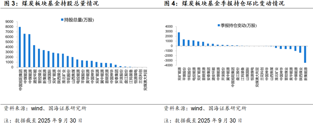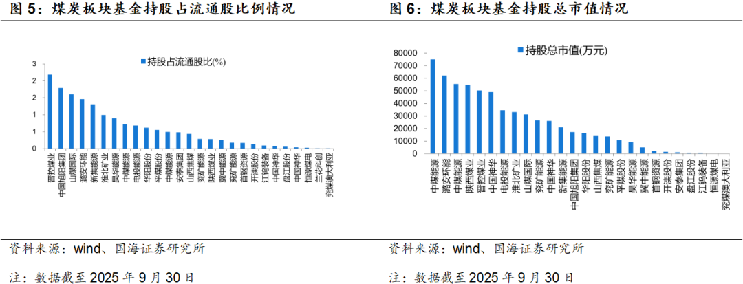 个股持有基金数方面(2025Q3,下文同),中国神华、陕西煤业、中国神华HK、潞安环能、中煤能源位列前5名。具体基金数量分别为中国神华(76只)、陕西煤业(39只)、中国神华HK(30只)、潞安环能(26只)、中煤能源(25只)。