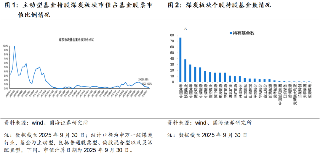 1、 2025年Q3主动型基金在煤炭行业持仓延续下降,占投资总市值比例为0.30%(环比-0.06pct)