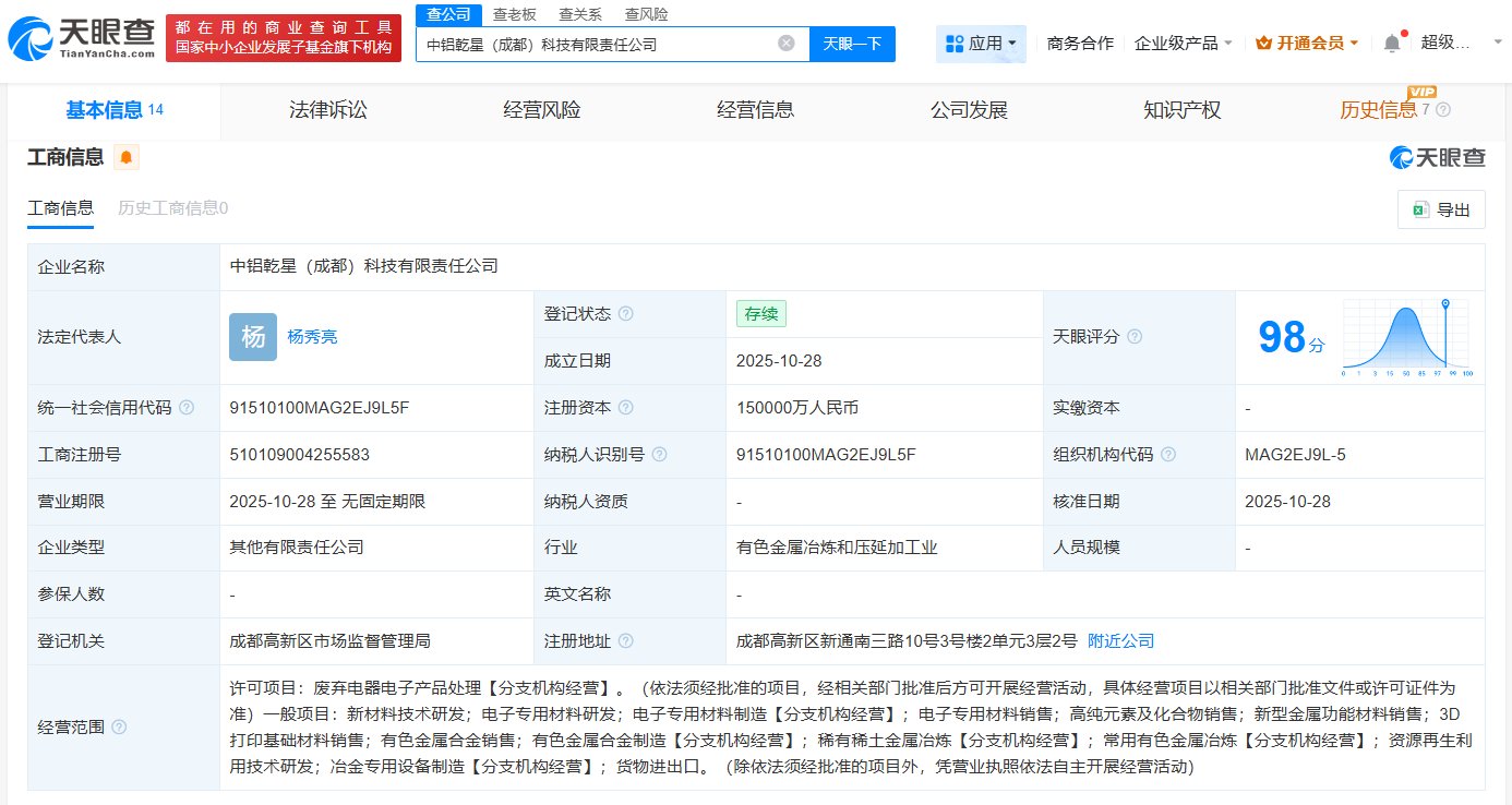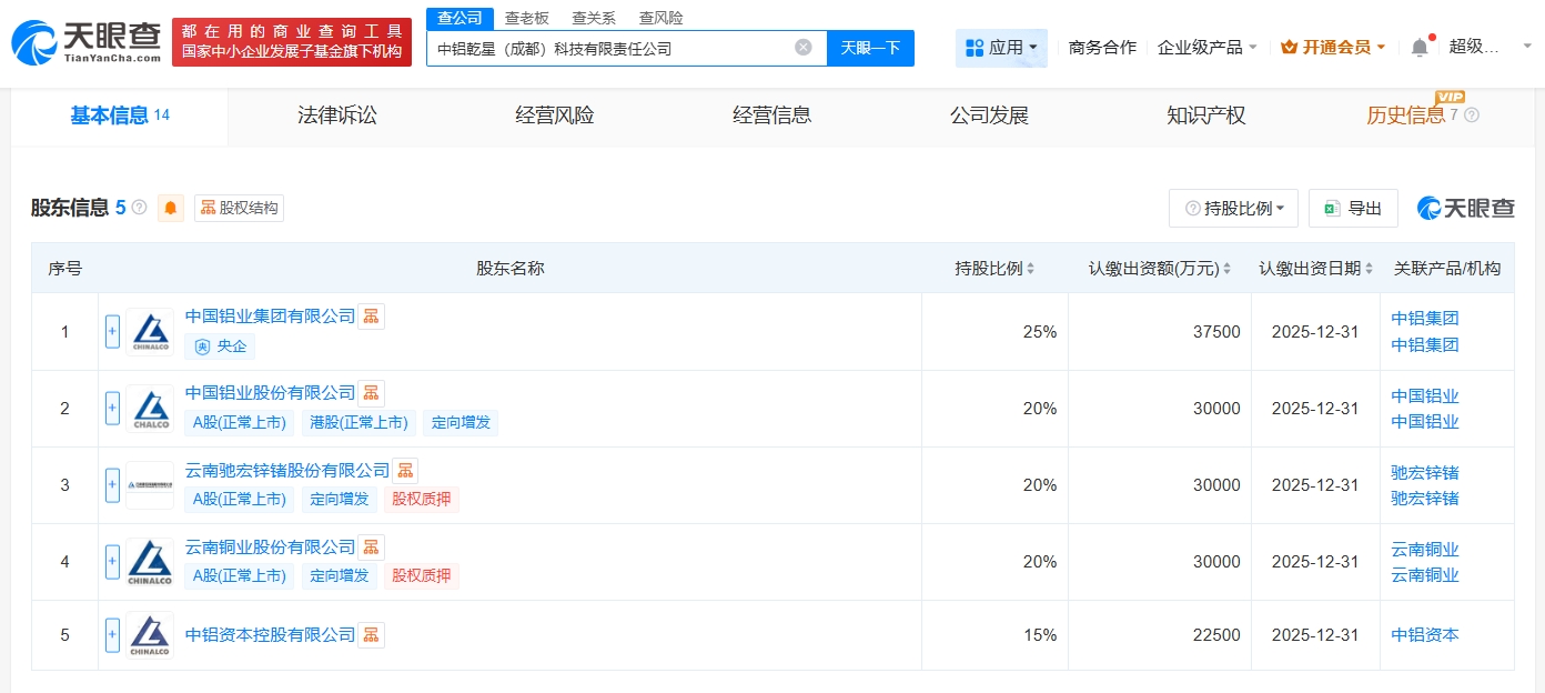 每经AI快讯,天眼查App显示,近日,中铝乾星(成都)科技有限责任公司成立,法定代表人为杨秀亮,注册资本15亿元,经营范围包括新材料技术研发、电子专用材料研发、电子专用材料制造等。股东信息显示,该公司由中国铝业集团有限公司、驰宏锌锗、云南铜业等共同持股。