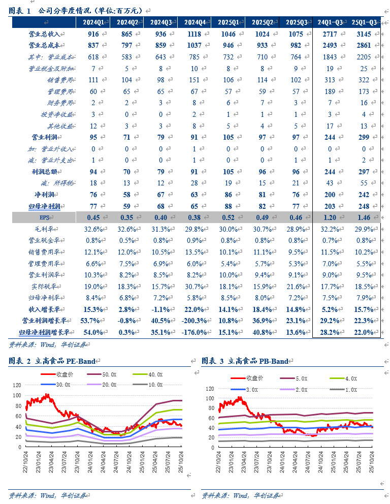 年内高景气预计维持,26年公司有望延续双位数增长,同时利润仍有较大改善弹性。尽管Q3成本扰动加剧,导致净利率改善趋势有所放缓,但值得关注的,一是公司营收好于预期,大客户Q4预计仍有新品,同时餐饮、茶饮等新客户不断打开,烘焙渠道变革产业趋势下,公司未来几年增长依旧具备保障,二是在产线承包、考核优化的背景下,公司相关费投继续收窄,效率仍在不断进阶。年内来看,公司Q4增势预计延续,同时利润有望环比优化,而往明年来看,25Q3打消增长质疑后,26年公司平稳增长置信度提升,利润率在原材价格下降、产线逐步爬坡、规模效应放大等等综合因素下,有望进一步提升,盈利仍有较大弹性空间,中长期来看公司稳态利润率有望持续进阶,盈利改善的势能或可贯穿未来数年。