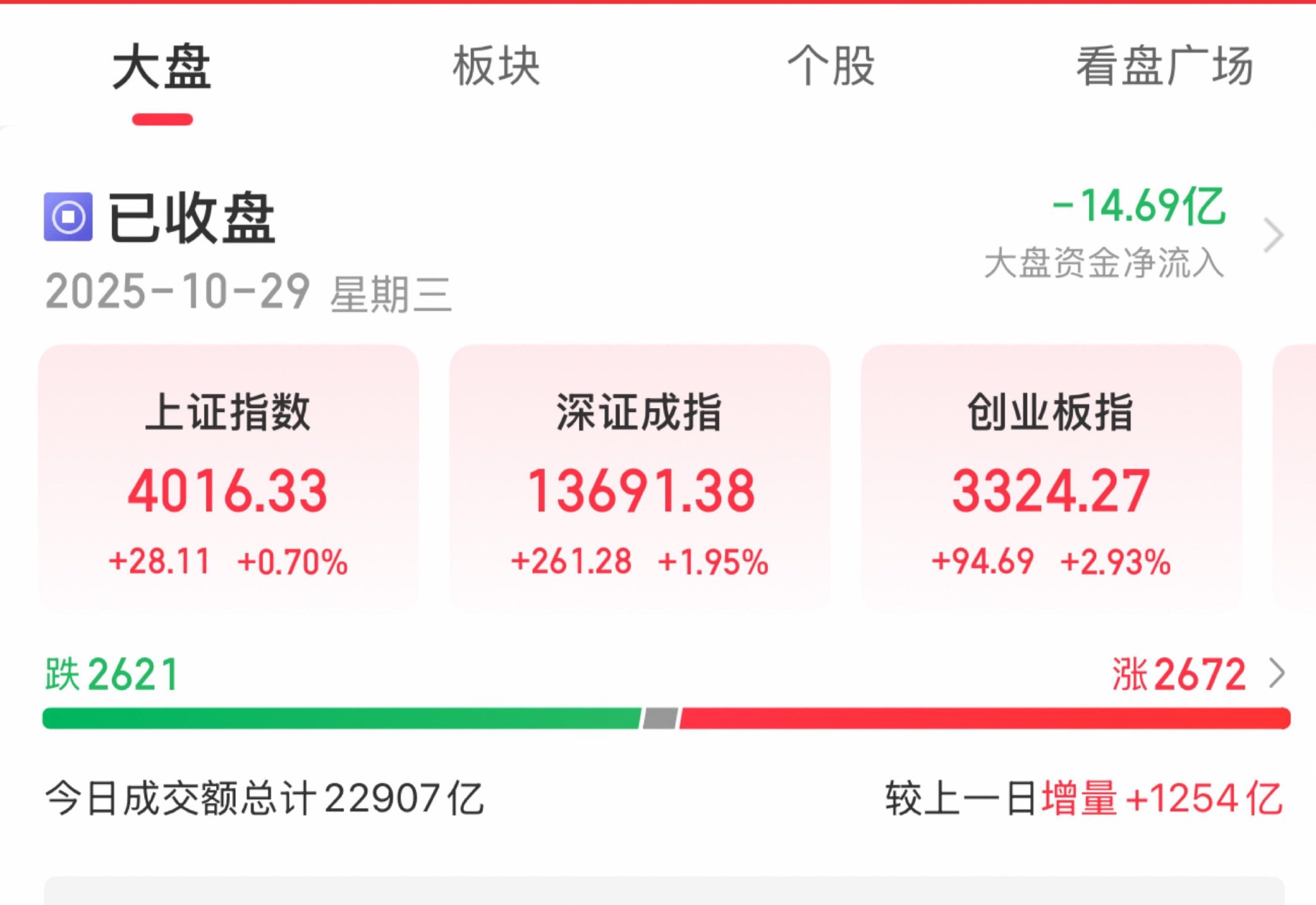 A股三大指数今日集体上涨,截至收盘,上证指数涨0.7%,深证成指涨1.95%,创业板指涨2.93%,北证50涨8.41%。沪深京三市全天成交额22907亿元,较上日放量1254亿元。全市场超2600只个股上涨。