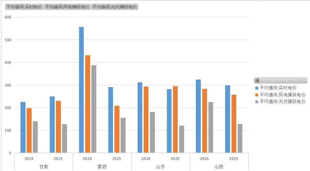 今年电价波动风险进一步释放。行业机构的数据显示,从主要电力现货市场数据来看:2025年1-9月,甘肃风电平均现货市场捕获价格229.63元/兆瓦时(同比+15.8%),光伏126.77元/兆瓦时(同比-9.55%);蒙西风电208.61元/兆瓦时(同比-51.73%),光伏154.71元/兆瓦时(同比-60.08%);山东风电294.84元/兆瓦时(同比+0.06%),光伏120.27元/兆瓦时(同比-33.47%);山西风电257.68元/兆瓦时(同比+8.95%),光伏128.54元/兆瓦时(同比-43.02%)。光伏电价的普遍下滑,成为行业盈利的主要压力点。