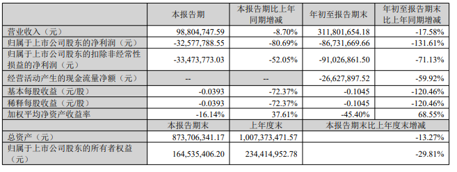 其中第三季度,公司营业收入为9880万元,同比下降8.7%;归母净利润自去年同期亏损1803万元变为亏损3258万元,亏损额进一步扩大。