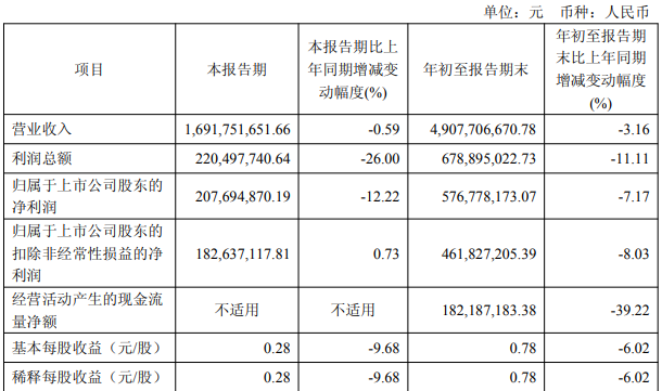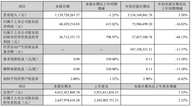 其中第三季度,公司营业收入为42.6亿元,同比上升6.3%;归母净利润为5561万元,同比下降44.7%;扣非归母净利润为6039万元,同比下降48.8%。