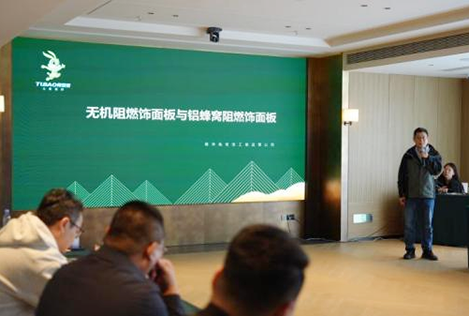 德华兔宝宝工装运营公司副总经理贾焕亮对新品进行了深度介绍,将兔宝宝无机阻燃饰面板与铝蜂窝板阻燃饰面板的市场规模、应用场景、产品性能特点、产品定位及客户定位娓娓道来。针对无机阻燃饰面板,贾总重点强调其“装配式适配+高阻燃性能”的双重特质;作为墙面装饰核心材料,它不仅契合当下工程端大力推进的装配式趋势,更能满足酒店、医院、学校、商业空间及住宅等场景对环保与安全的高要求,填补了当前无机饰面板在饰面应用领域的市场空白。而铝蜂窝阻燃饰面板则凭借“多场景复用”优势备受关注,在吊顶、柜材领域的传统应用,让经销商们直观感受到产品的市场接受度。贾总的讲解既有数据支撑,又结合产品性能与实际项目案例,让在场经销商对新品的竞争力有了清晰认知。