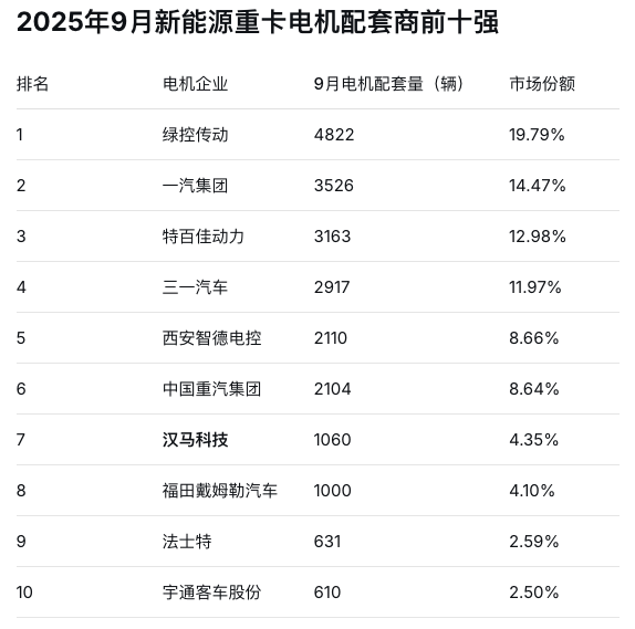 9月数据显示,新能源重卡电机市场“四强领先、十强垄断”的竞争格局进一步固化。绿控的持续领跑、一汽解放的强势跃升、三一的自配套崛起,都成为现阶段市场看点。