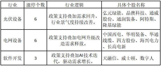 从行业特征来看,今日涨停板个股中,光伏设备、电网设备、软件开发行业的个股最多。