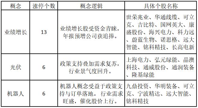 从概念特征来看,今日涨停板个股中,业绩增长、光伏、机器人概念的个股最多。