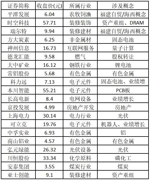 涨停板个股中,股价创出近一年新高的个股有20只(不包括创出历史新高的个股),包括平潭发展、时空科技、瑞尔特、方大炭素、神州信息、德龙汇能、大中矿业、常铝股份、科力远、本川智能、长高电新、京投发展、上海电力、可立克、中孚实业、南山铝业、弘元绿能、川恒股份、安泰集团、亚士创能,具体如下表所示。