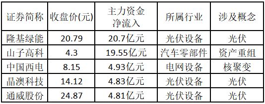 从主力资金来看,今日涨停板个股中,主力资金净流入金额排名前5的个股分别是隆基绿能、山子高科、中国西电、晶澳科技、通威股份。
