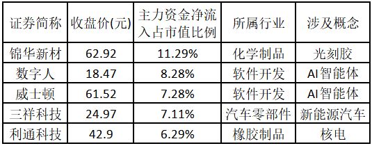 主力资金净流入金额占市值比例排名前5的个股分别是锦华新材、数字人、威士顿、三祥科技、利通科技。