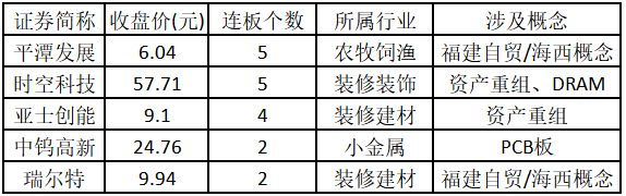 从连板情况来看,今日首板个股有49只;2连板的个股有8只;3连板及以上的个股有3只。今日连板数排名前5的个股包括平潭发展、时空科技、亚士创能、中钨高新、瑞尔特,具体如下表所示。