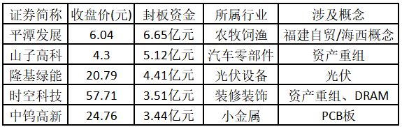 从封板资金来看,今日涨停板个股中,封板资金排名前5的个股包括平潭发展、山子高科、隆基绿能、时空科技、中钨高新。欢迎大家关注微信公众号“道达号”,其“道达涨停复盘”栏目为大家解读。