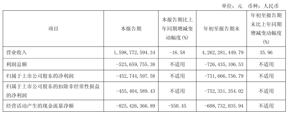 其中,2025年第三季度,公司实现营业收入15.99亿元,同比下降16.58;实现归属于上市公司股东的净利润-4.53亿元;实现归属于上市公司股东的扣除非经常性损益的净利润-4.55亿元。