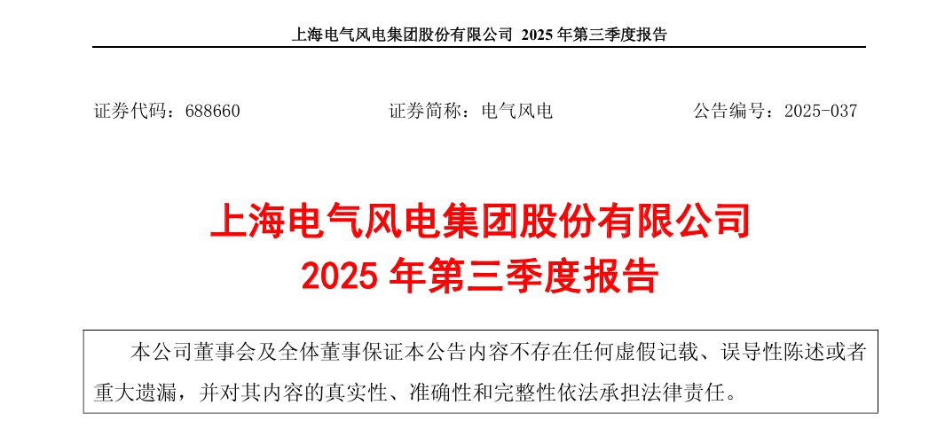 10月29日,上海电气风电集团股份有限公司(以下简称“电气风电”或“公司”)发布《2025年第三季度报告》。