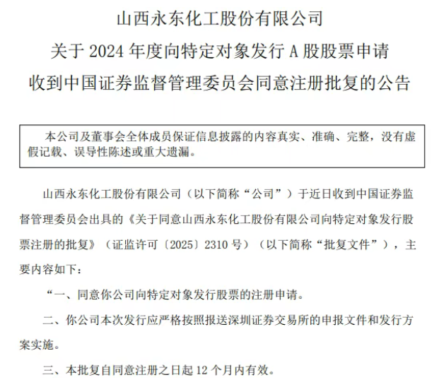 10月23日,山西省A股上市企业永东股份(股票代码:002753.SZ)发布公告称,公司近期收到中国证监会出具的《关于同意山西永东化工股份有限公司向特定对象发行股票注册的批复》,该定向增发方案正式获批,募集资金总额不超过3.65亿元。