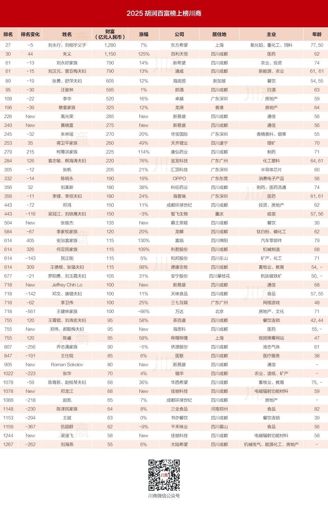 据川商传媒记者梳理,共有46位居住地或籍贯在四川的企业家上榜“2025胡润百富榜”,占总人数的3.2%,总财富达10978亿元,行业涉及化工、医药、农业、新能源、房地产、食品等。