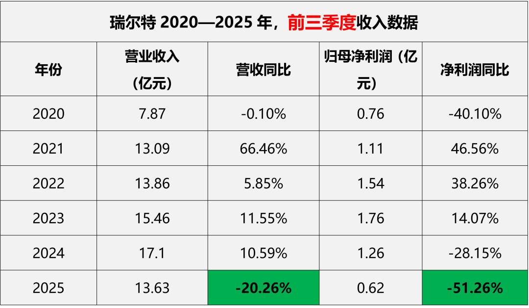 按往年前三季度的数据对比来看,更能看出瑞尔特今年面临的挑战。从2020年到2025年,瑞尔特每年前三季度的收入和利润中,2025年是首次收入出现超过两位数的下滑,降幅达到20.26%;净利润方面更是大跌51.26%,为近年来少见。