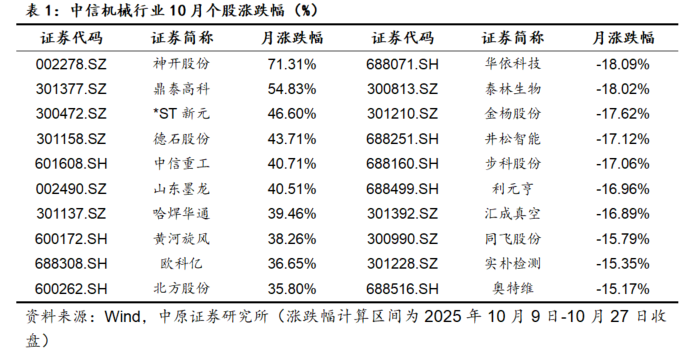 个股方面,截至2025年10月27日收盘,沪深两市10月中信机械板块632只个股,其中344只上涨,285只下跌,涨跌幅中位数为1.07%。
