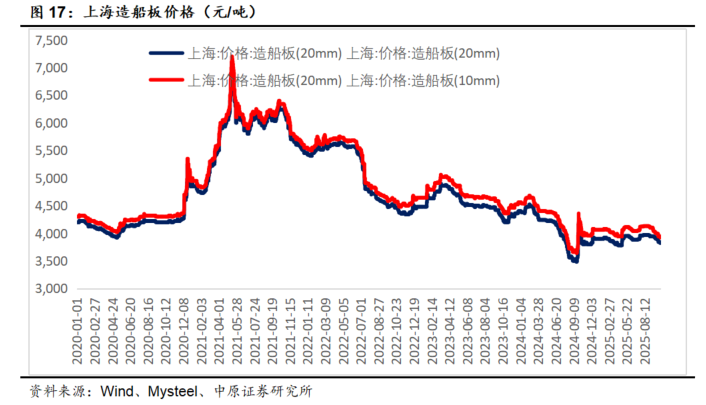 20mm造船板价格2021年见顶后持续调整,2025年10月底小幅跌至3820元/吨,整体仍处于低位,有利于船舶制造企业盈利修复。