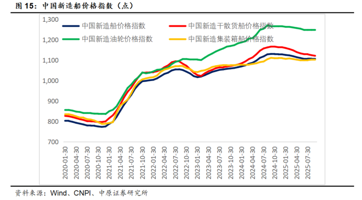 2025年9月底中国新造船价格指数为1106点,环比下跌1个点。其中,中国新造干散货船价格指数1122,中国新造油轮价格指数1249,中国新增集装箱船价格指数为1104,环比分别下跌3、0、-1个点。