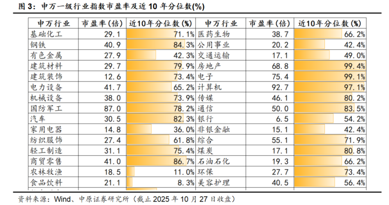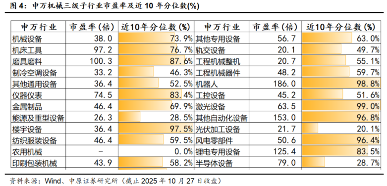 从申万一级行业指数市盈率及近10年分位数来看,截止2025年10月27日收盘,申万机械行业市盈率为38倍,位于近10年市盈率分位数的73.9%,处于行业估值均值水平以上。