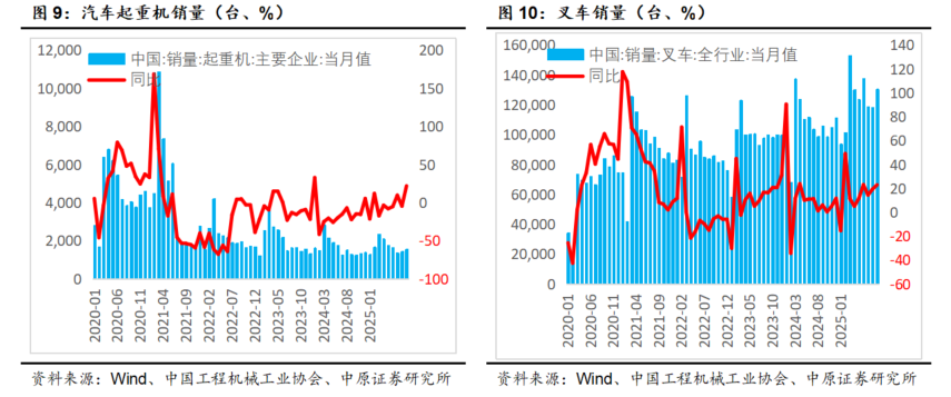 2025年9月当月销售各类汽车起重机1561台,同比增长21.9%,其中国内销量764台,同比增长40.7%;出口量797台,同比增长7.99%。