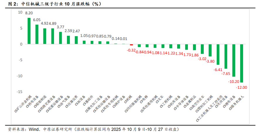 截至2025年10月27日收盘,10月中信机械板块下跌0.32%,跑输沪深300指数(1.62%)1.94个百分点,在30个中信一级行业中排名第19名。10月三级子行业中矿山冶金机械、核电设备、船舶制造涨幅靠前,分别上涨8.2%、6.05%、4.92%;服务机器人、锂电设备、光伏设备涨幅靠后。