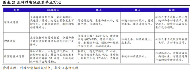 机器人电关节模组是机器人系统中至关重要的组成部分,负责连接机器人的各个部件,使机器人能够实现精确的运动和动作。机器人电关节模包括电机(无框力矩电机、空心杯电机)、精密减速器(谐波减速器、RV 减速器、精密行星减速器)、编码器、传感器(一维/六维力传感器)等。这些部件共同协作,使机器人电关节模组能够实现精确的运动控制和力矩传递,满足机器人在各种复杂任务中的运动需求。机器人转动关节核心部件:精密减速器。精密减速器是机器人转动关节的核心零部件。精密减速器具备体积小、重量轻、精度高、稳定性强等特点,能够对机械传动实现精准控制,主要可以分为谐波减速器、RV 减速器、精密行星减速器。谐波减速器具有体积小、质量小、传动精度高、运转平稳等优点,因此主要应用于机器人小臂、腕部、手部等部件;RV 减速器的优点包括传动比范围大、传动效率高、刚性和耐过载冲击性能好等,主要应用于机器人的机座、大臂、肩部等大关节;精密行星减速器具有大扭矩高刚性、高单级传动效率、寿命长等优点,主要与伺服电机、控制器共同组成机器人的驱动装置。