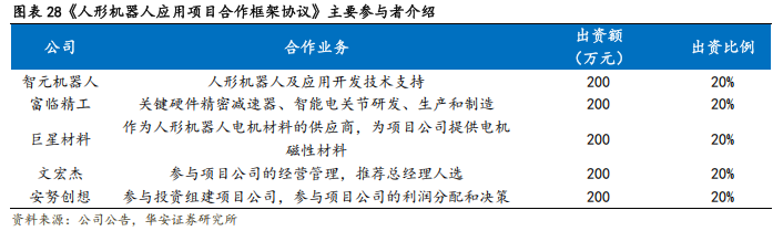 签订合作协议,加速布局人形机器人领域。2024 年 10 月,与智元机器人签署《人形机器人应用项目合作框架协议》。2025 年 2 月与智元机器人签署《人形机器人应用项目投资合作协议》,成立合资公司(持股 20%),富临供应机器人电关节模组和电机磁性材料,同时继续拓展谐波减速器等零件,单机价值量有望继续提升。同月,公司与绵阳市政府签订《机器人智能电关节模组研发及生产基地项目投资协议》,拟在当地投资建设机器人智能电关节模组研发及生产基地项目,项目总投资金额 1.1亿元。2025 年 3 月,公司与宁德时代签署《战略合作协议》,进一步拓展在汽车及智能机器人等创新领域增量零部件及关节的合作机会。此外,公司与华为机器人相关部门全面合作,整合减速器、智能控制及电机技术,拓展谐波减速器和行星减速器两个平台的电关节产品,已进行小批量生产和交付,后续不排除向本体发展。