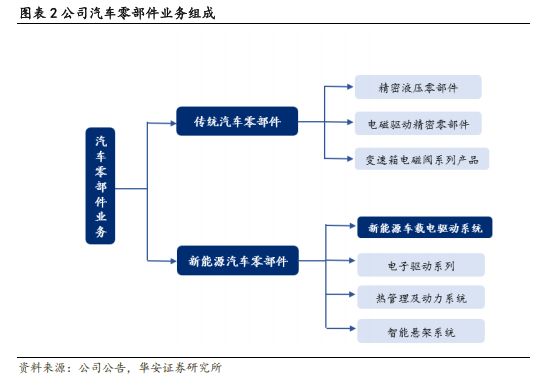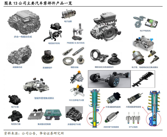 公司汽车零部件产品包括汽车发动机零部件和新能源汽车零部件两部分。(1)汽车发动机零部件:公司长期深耕汽车发动机零部件领域,与各主机厂保持着密切的同步研发, 为主机厂的产品更新和技术进步提供支持,确保公司在产品设计、生产工艺及技术上的领先地位。公司通过持续的自主创新与市场开拓,已成为国内汽车发动机零部件细分领域的龙头企业和隐形冠军, 其主要产品精密液压零部件和电磁驱动零部件首先实现国产替代。(2)新能源汽车零部件:公司依托精密制造优势,加快布局新能源汽车智能电控及增量零部件,包括热管理系统、新能源汽车减速器、智能减震系统等, 主要代表产品为电子水泵、电子油泵、车载减速器总成和可变阻尼减震器电磁阀(CDC)系列产品、 智能刹车电机等。公司在电动 VVT 以及智能电控零部件的技术储备、客户资源等方面均具有先发优势,在高门槛的技术条件下,更具市场竞争力。公司与比亚迪、上汽、通用、大众、理想、蔚来、小鹏、博世、联合电子等下游客户的技术研发中心建立长期的产品合作研发关系,以快速响应整车厂或主机厂的技术需求和产品需求公司 25H1 实现汽车零部件主营业务收入为 18.37亿元,同比上升 13.34%。随着公司新能源汽车增量智控部件的电驱动减速系统和智能热管理系统业务快速放量,经营结构向新能源增量领域快速切换。