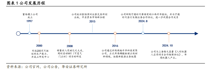 2015 年,公司成功登陆深圳证券交易所创业板,开启了资本市场新征程,借助资本市场的力量,公司加速技术研发和市场拓展的步伐。2016 年,公司通过并购湖南升华科技有限公司,正式布局磷酸铁锂正极材料领域,拓展新能源业务版图。这一战略布局,使公司快速切入新能源汽车核心零部件领域,为公司未来的发展开辟了新的增长极。展望未来,公司前瞻性布局机器人赛道。2024 年 8 月,公司回购宁德时代等持有的江西升华股权,并与宁德时代签订长期业务合作协议,进一步巩固了合作关系,有助于公司在磷酸铁锂正极材料领域进一步提升市场份额和行业影响力,还为公司在新能源汽车产业链中的协同发展提供了更广阔的空间和机遇。2024年 10 月,公司与上海智元签署《人形机器人应用项目合作框架协议》,前瞻布局机器人产业。使公司能够在新兴的人形机器人产业中抢占先机,探索新的业务增长点。