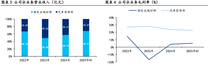 汽车零部件:公司在传统汽零领域具备成熟的工艺技术和稳定的客户基础,营收规模保持稳定。新能源增量零部件产品进入收获期,智能电控产业的热管理系统和新能源电驱动系统业务获多家国产自主品牌及主流新势力车企热销项目新定点,相关新产品批量交付,成本优势及规模化放量趋势凸显。我们预计 2025/2026/2027年汽车零部件业务营收分别为 40/45/51 亿元,增速分别为 12%/12%/12%,因年降 2025年毛利率略下滑,2026-2027 年规模效应化解年降压力,预计毛利率平稳,2025/2026/2027 年汽车零部件业务毛利率分别为 22.7%/22.7%/22.7%。锂电正极材料业务:1)出货量方面:根据 2025 年中报,公司锂电正极材料业务上半年出货量表现良好,全年出货量目标有望超额完成,我们预计 2025/2026/2027年公司锂电正极材料出货量为 27、45、60 万吨。2)价格方面:行业反内卷推动行业格局优化,快充及高压实市场需求是不可逆的产业趋势,随着市场需求持续释放,价格端将逐步体现产业优势。目前五代产品市场供给处于紧缺状态,未来随着客户需求释放,五代产品占比将进一步提升,价格溢价空间有望扩大,因此我们预计2025/2026 年高压密正极材料价格的稳步上升。3)毛利率方面:公司磷酸铁锂业务已进入技术性能与成本并重的发展阶段,高压实快充市场需求形成,公司市场占位和盈利能力持续提升,公司已规模化供应四代产品,并逐步推进五代产品,未来有望通过产品代差优势提升利润,我们预计 2025/2026/2027 年正极材料毛利率为6.4%/7%/7.2%。