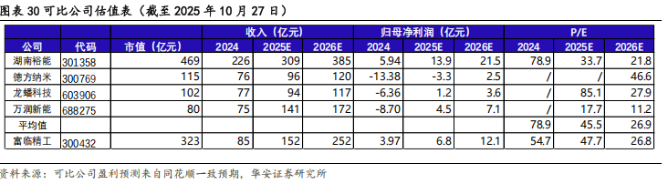 相对估值法:我们选取了 A 股相关公司作为富临精工的可比公司。根据监管要求的行业分类,可比公司包括湖南裕能、德方纳米、龙蟠科技、万润新能。上述公司与富临精工同隶属于锂电池磷酸铁锂正极赛道,主营业务相近,2025 年平均 P/E 为 45.5x,公司磷酸铁锂业务竞争力强,汽车零部件业务盈利稳定,机器人业务前景广阔,目前估值和行业平均水平相近,首次覆盖,予以“买入评级”。