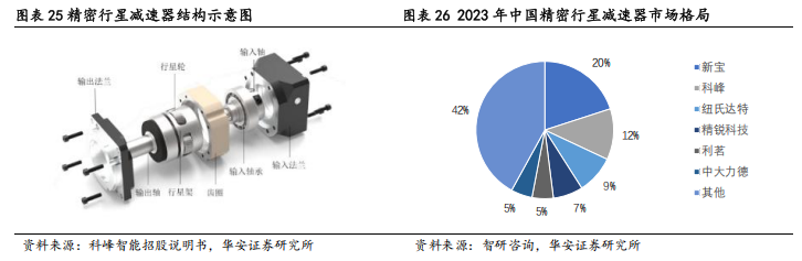 行星减速器市场以日德厂商为主,国产替代率较低。根据智研咨询数据,2023年中国精密行星减速器市场中一半以上的精密行星减速机产品由日本新宝、湖北科峰、纽氏达特、精锐科技和利茗制造生产;在主要的十家精密行星减速机企业中,外资企业占据 70%的市场份额,其中,日本新宝的市场份额最大,占比 20%;湖北科峰作为中国市场排名第二,占比为 12%。