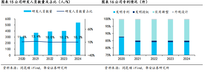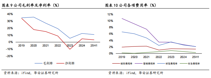 经营杠杆效应持续释放,费控体系展现战略韧性。企业通过精益化转型费控管理,2020 年至 2024 年期间费用率指标走出 17%→15%→8%→9%→7%的优化曲线,较峰值压缩近十个百分点,折射出管理层"刀刃向内"的改革成效。2023 年费用率微幅波动,适度回升实为收入规模波动下的调整。在降本增效主旋律下,25H1 公司管理/销售/财务费用率分别为 2.1%/1.4%/0.3%,研发费用率仍坚守战略水位,25H1 研发费用率保持在 2.1%的水平。2026 年随着供应链降本效应逐步显现,盈利能力有望进一步改善。
