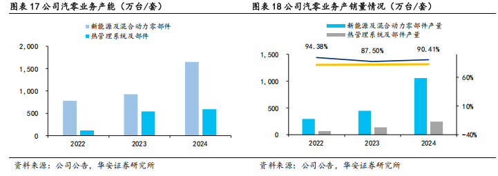 公司汽零业务现有产能储备良好,布局不断完善,产销率水平较高。根据公司2025 年中报,1)公司新能源汽车增量零部件领域,车载电驱动减速器产线年产能已形成 50 万台,电驱动三合一动力总成线具备年 24 万台产能,差速器具备 93 万台套年产能,已经全部形成。同时,已形成了变速箱电磁阀年 1,000 万只,GDI 泵壳年400 万只、减速器齿轴年 170 万套、减速器壳体年 18 万套的产能;CDC 电磁阀年 300万支产能。2)公司控股子公司芯智热控从事新能源汽车热管理产品及相关零部件的研发、制造和销售,主要代表产品为电子水泵、电子油泵和热管理模块,目前新能源汽车智能热管理模块及零部件集成化已达到量产状态、电子水泵、电子油泵等智能电控产线均进行了新增和技改扩能,已形成电子主水泵年 400 万台、电子油泵年 110万台,电子执行器年 60 万台,热管理集成模块年 24 万套的产能。3)公司全资子公司常州富临精密传动有限公司主要从事新能源汽车减速器齿轴、三合一电驱系统等核心零部件的研发、生产与销售,富临精密高端新能源汽车核心零部件项目正在加速量产,搭建年产 100 万套新能源汽车高速减速器齿轴生产平台,配套国内造车新势力品牌汽车主机厂,积极引进先进设备,构建成熟工艺生产体系,协同长三角创新战略伙伴开展深度合作,完善新能源汽车行业产业链上下游配套,为公司立足长三角长效发展踏出坚实的一步。