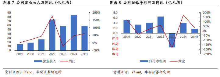 25H1 营收与净利均实现同比高增。2019 年经历战略调整后,公司紧抓新能源汽车产业机遇,经营质量显著提升。2022 年迎来爆发式增长,全年营业收入突破 73.5亿元,同比激增 176.6%,归属母公司净利润达 6.45 亿元,同比增长 61.7%。面对 2023年行业竞争白热化与价格体系重构的双重压力,企业经历短期业绩波动。通过深化与新势力车企合作、成功量产高压实密度磷酸铁锂创新产品,叠加产能利用率提升带来的成本优势,公司展现强劲回升势头。25H1 公司实现营业收入 58.13 亿元,较上年同年增长 61.70%;实现归属于上市公司股东的净利润 1.74 亿元,较上年同期增长 32.41%;实现归属于上市公司股东的扣非净利润 1.21 亿元,较上年同期增长2.66%。