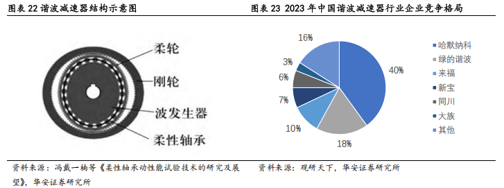 谐波减速器是机械传动领域的一种核心零部件。根据结构形式不同,一般分为杯形和礼帽形谐波减速器。柔轮和轴承是谐波减速器的核心传动零部件,其复杂的变形和应力分布影响了谐波减速器的传动性能和疲劳寿命。中国厂商在国内谐波减速器市场中具备一定竞争力。全球减速器市场中谐波减速器行业头部厂商为哈默纳科,国内参与者主要有绿的谐波、来福谐波、同川科技等,目前国内厂商在减速比、额定扭矩、传动效率、精度方面已接近或达到国际先进水平,但使用寿命方面与国际头部厂商产品仍有一定的差距。