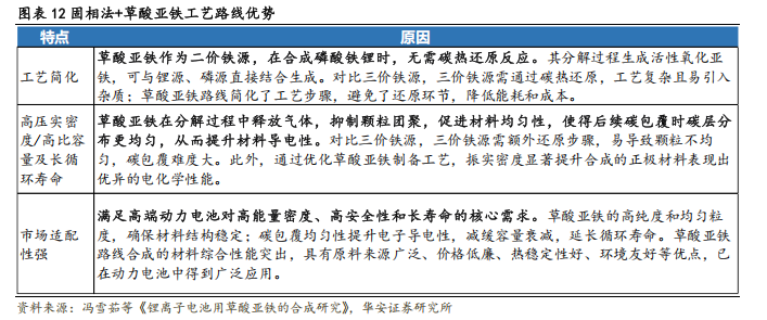 公司子公司江西升华采用草酸亚铁工艺路线制备磷酸铁锂正极材料。其核心优势体现在三方面:1)工艺简化与降本:草酸亚铁作为二价铁源,在高温固相法中无需碳热还原(三价铁源需额外还原步骤),直接分解生成活性氧化亚铁,与锂、磷源结合生成,避免了杂质引入,显著降低工艺复杂度与能耗成本。2)性能优化:草酸亚铁分解释放 CO/CO₂气体,抑制颗粒团聚,提升材料均匀性,结合工艺参数优化使碳包覆更均匀,导电性增强,循环寿命优异。3)市场适配性:高纯度、高结构稳定性及均匀碳包覆赋予材料高压实密度、高热安全性,适配动力电池对能量密度(≥180 Wh/kg)、长寿命(循环衰减低)和可靠性的核心需求,叠加原料成本低、环境友好等优势,成为高端动力市场的主流选择。