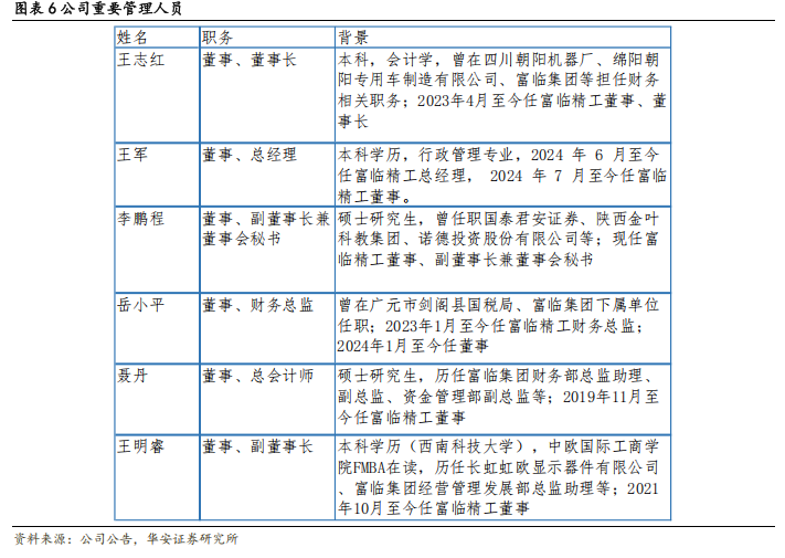 管理层多出身富临集团,行业经验丰富。公司高管基本都跟随集团战略参与了新能源汽车相关技术的研发以及产业化应用,具备对新能源行业的理解,支持磷酸铁锂正极材料的发展,始终走在行业前列。公司董事会成员现有 9 人,董事长王志红,曾在四川朝阳机器厂、绵阳朝阳专用车制造有限公司、富临集团等担任财务相关职务,2023 年 4 月至今任富临精工董事、董事长。副董事长李鹏程曾任职于国泰君安证券股份有限公司担任投资银行总部高级经理,在诺德投资股份有限公司担任副总经理,全面参与公司的战略管理和资本运作,积累了丰富的上市公司治理和投资管理经验。