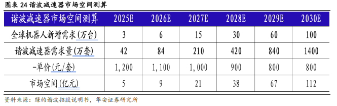 根据测算,在 100 万台人形机器人销量的假设下,我们预计行星减速器市场规模约12 亿元。