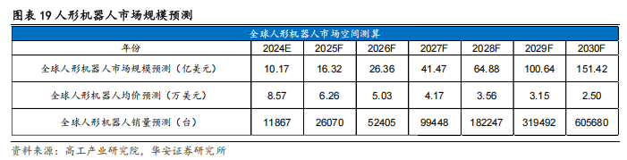 高工机器人产业研究所(GGII)通过测算人形机器人在不同领域的渗透率预测,2024 年全球人形机器人市场规模为 10.17 亿美元,到 2030 年全球人形机器人市场规模将达到 151 亿美元,2024-2030 年 CAGR 将超过 56%,全球人形机器人销量将从 1.19 万台增长至 60.57 万台。