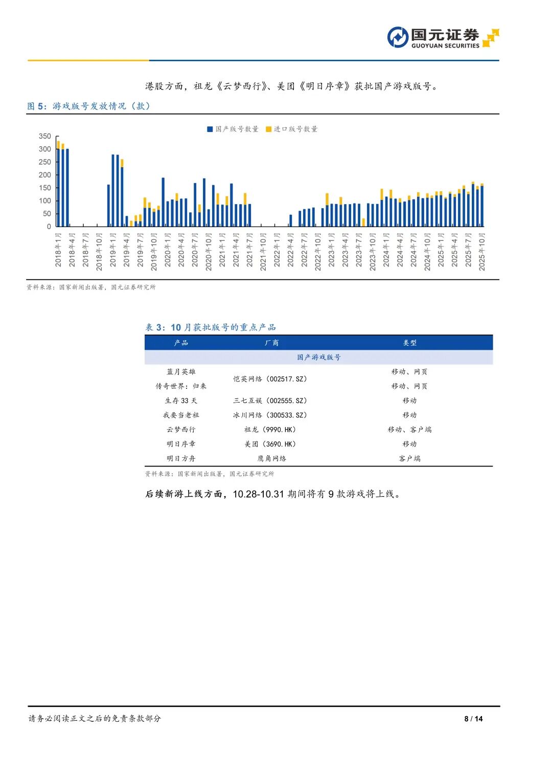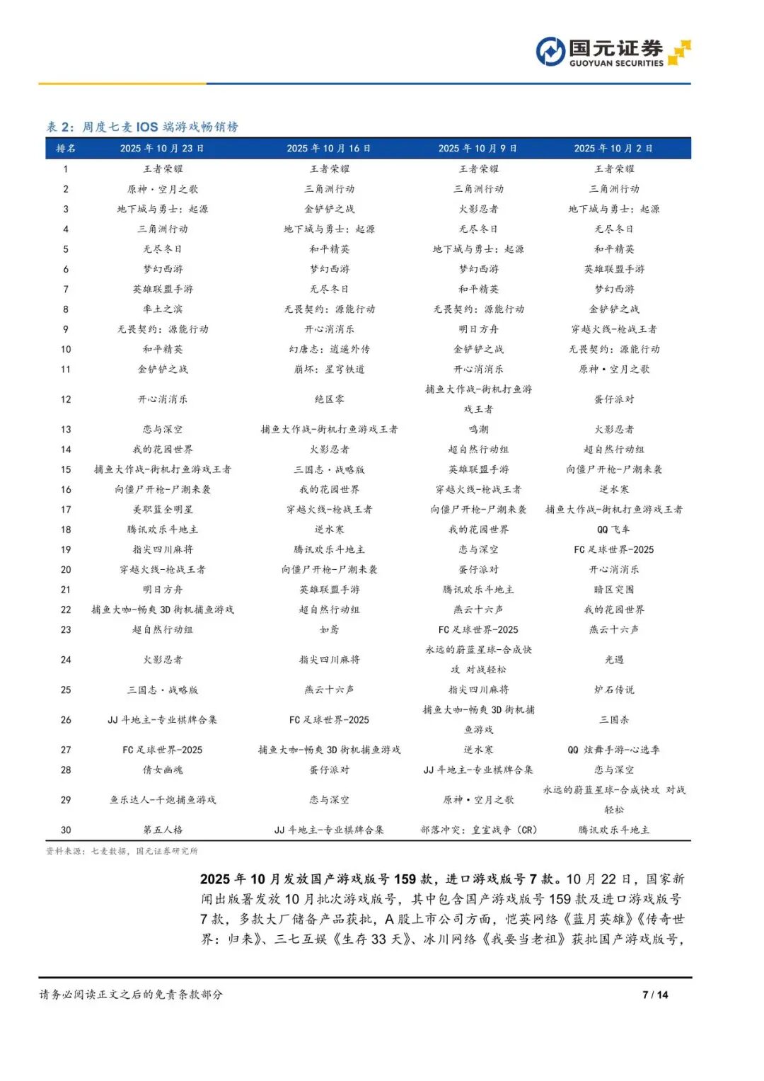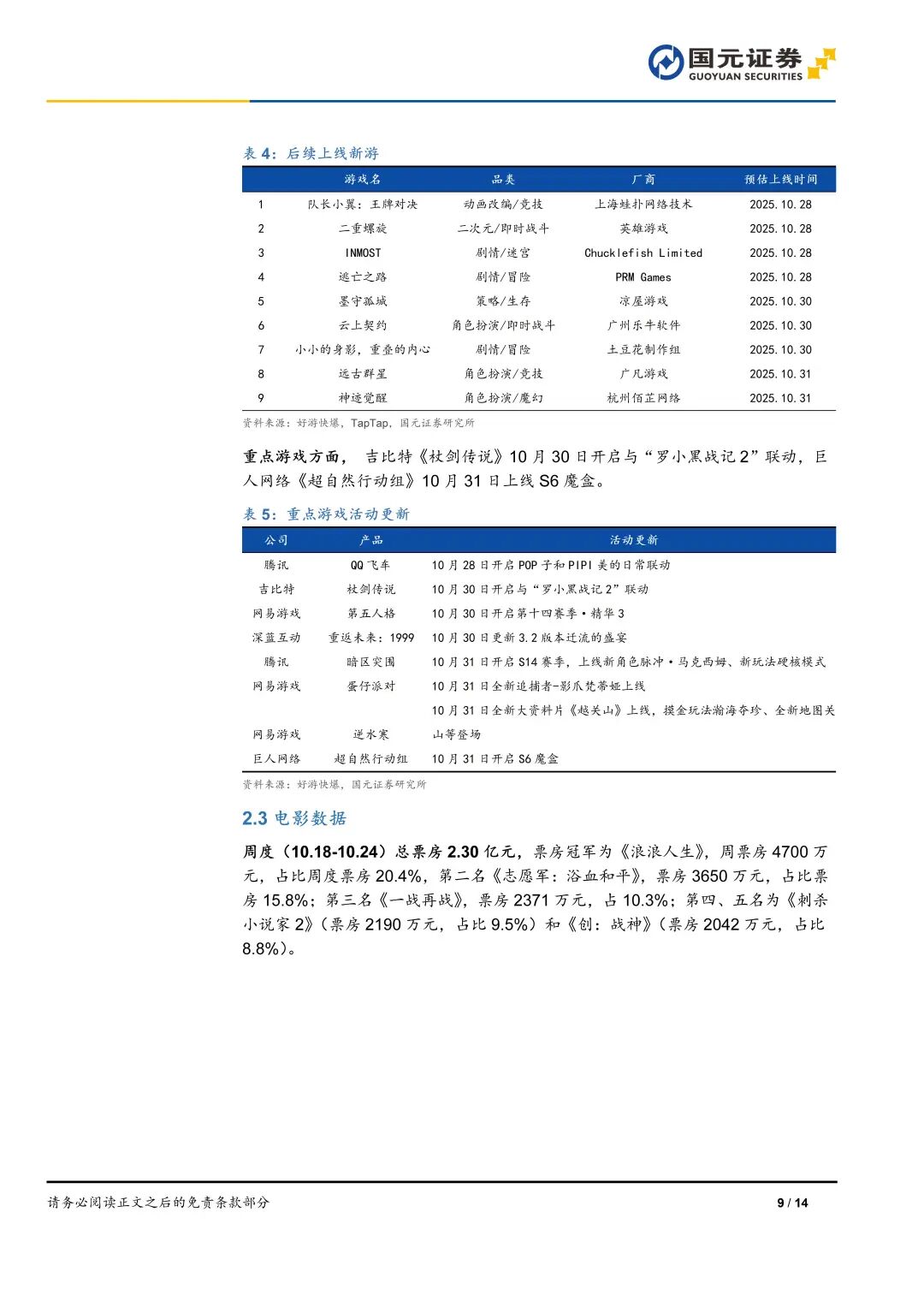 游戏:10月22日,国家新闻出版署发放10月批次游戏版号,其中包含国产游戏版号159款及进口游戏版号7款,多款大厂储备产品获批,A股上市公司方面,恺英网络《蓝月英雄》《传奇世界:归来》、三七互娱《生存33天》、冰川网络《我要当老祖》获批国产游戏版号,港股方面,祖龙《云梦西行》、美团《明日序章》获批国产游戏版号。周度IOS游戏畅销榜方面,10月23日IOS游戏畅销榜中,《王者荣耀》、《原神·空月之歌》和《地下城与勇士:起源》为畅销榜前3名。《超自然行动组》10月23日上线新武器“长枪”,10月31日将上线S6魔盒,包含莉莉新时装、新道具、限定舞蹈等,万圣节游戏内还将免费领取限定万圣氛围南瓜头套与南瓜家具免费领取,本周七麦IOS端游戏畅销榜排名在14-25名,吉比特《杖剑传说》排名40名上下,十月底将开启与“罗小黑战记2”联动。