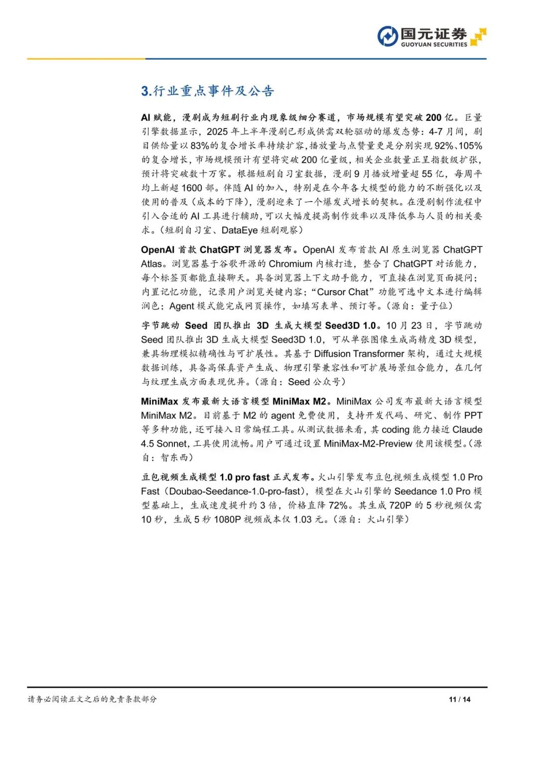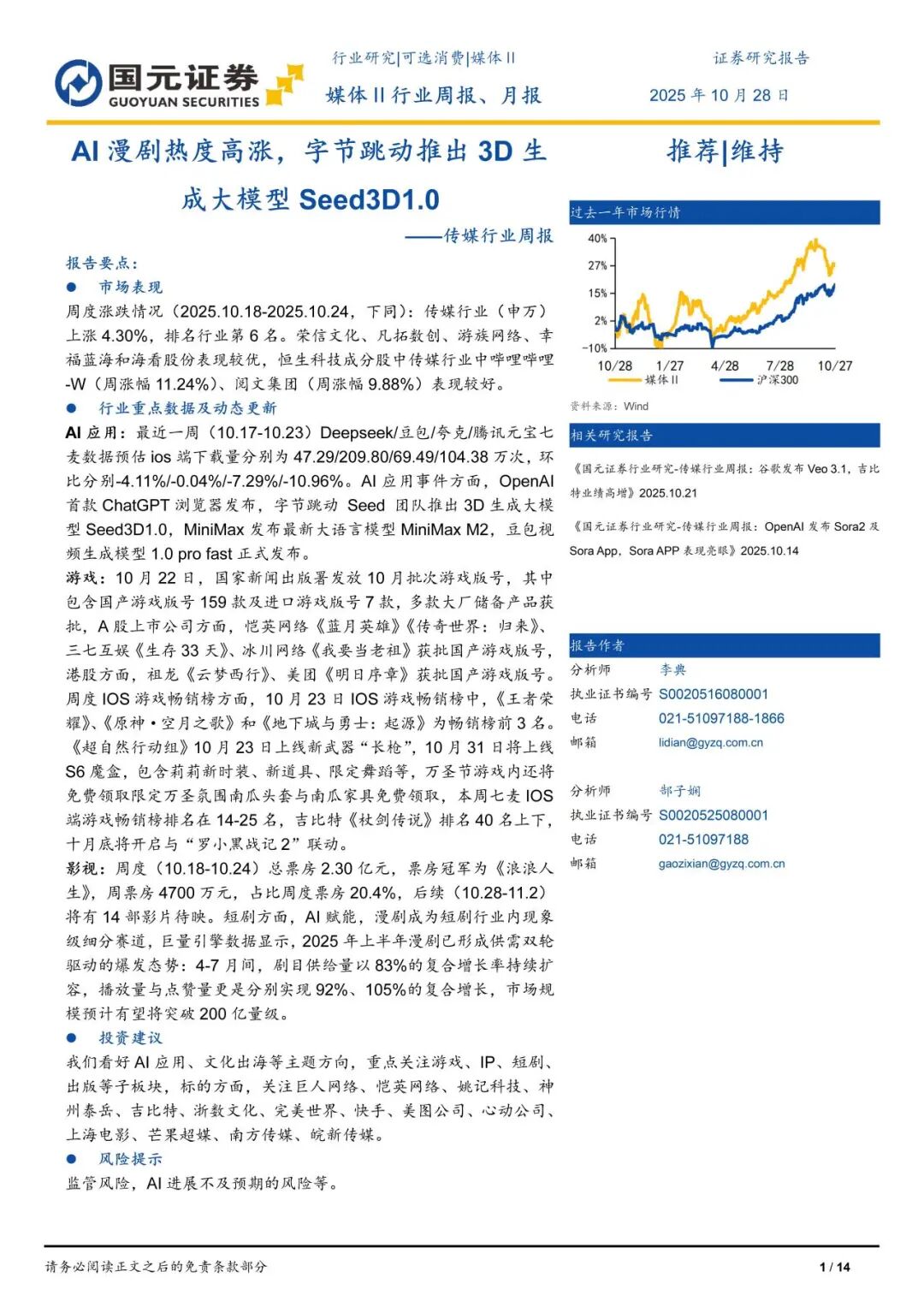 本报告摘自国元证券2025年10月28日已发布的《AI漫剧热度高涨,字节跳动推出3D生成大模型Seed3D1.0——传媒行业周报》,具体报告及分析内容请详见报告。若因对报告的摘编等产生歧义,应以报告发布当日的完整内容为准。